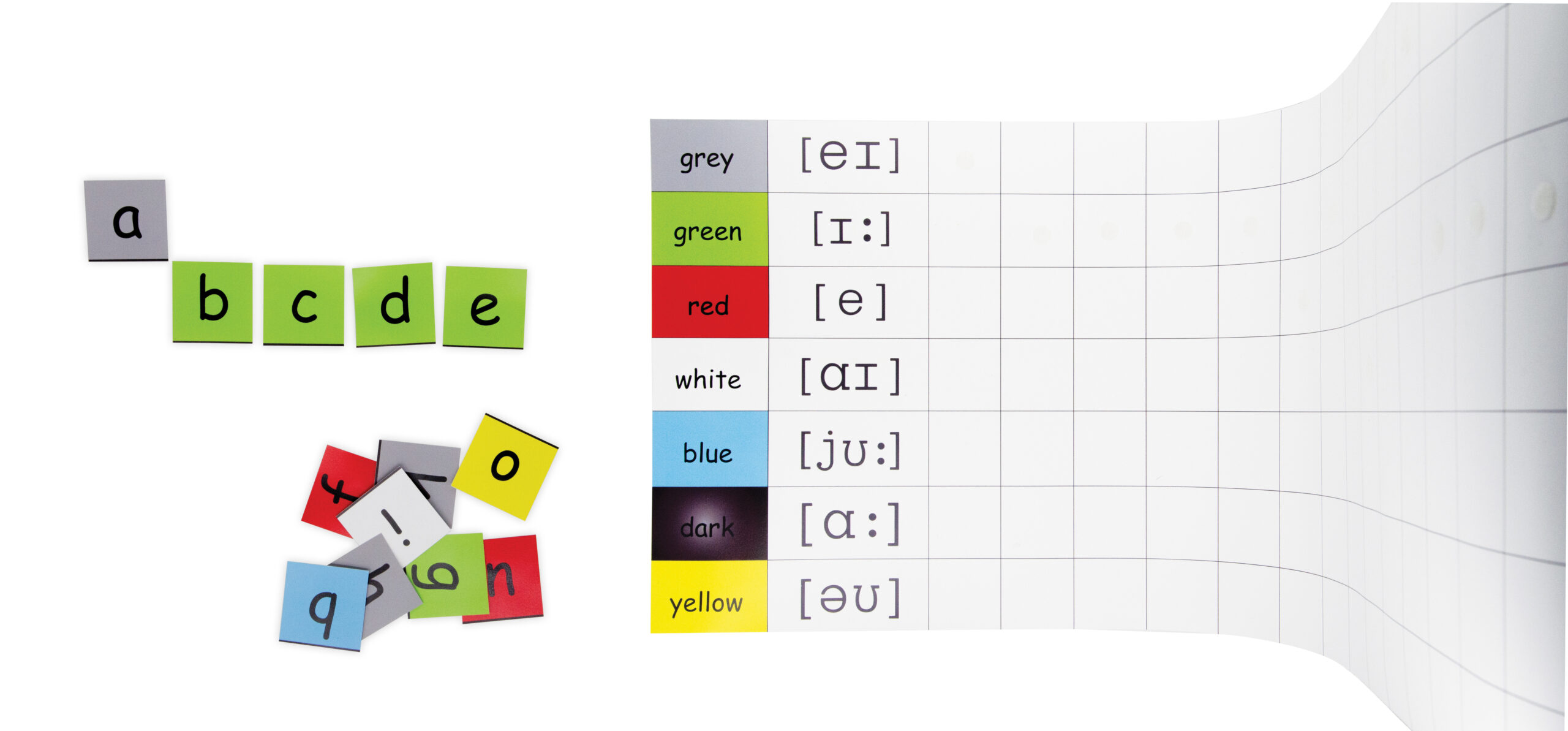 Ces lettres ont un NOM, elles sont nommées « a », « b », « c », etc. Mais elles n’ont pas -contrairement au français- un son qui demeure le même, quelque soit le mot (sauf exceptions). En raison de cette difficulté supplémentaire pour l’apprenant francophone, nous utilisons ici comme moyen mnémotechnique une couleur attribuée à chaque son référent utilisé pour nommer les lettres de l’alphabet. Ces noms de couleurs se prononcent à l’identique du nom de la lettre qui porte la même couleur.